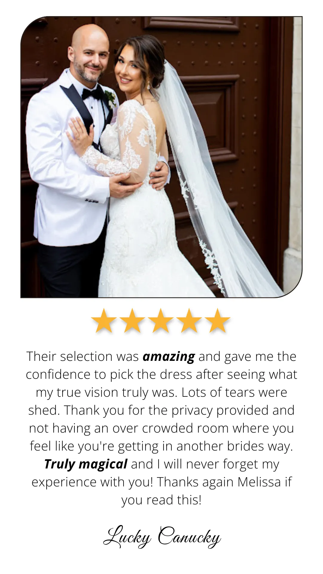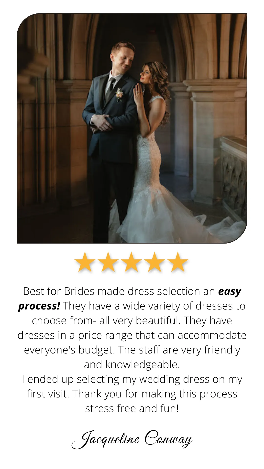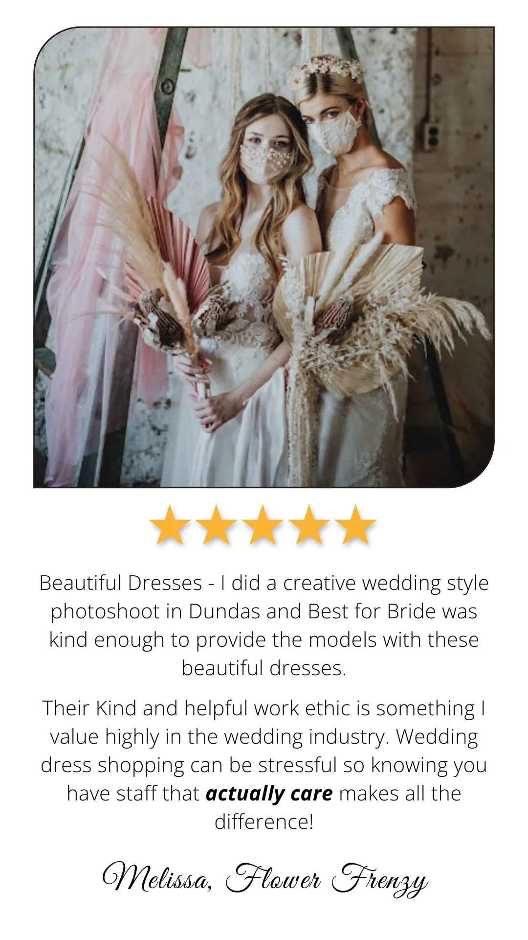 At Best for Bride, we’re all about celebrating every bride’s individuality. With our boutiques across Ontario, including in Toronto, Mississauga/Etobicoke, Hamilton, and Barrie, we create a welcoming space for every bride to find her perfect dress, whether her style is timeless elegance or modern chic.