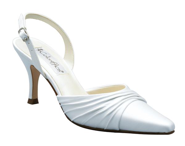 This Elegant Dyeable White Satin Closed-Toe Shoe Features a Richly Pleated