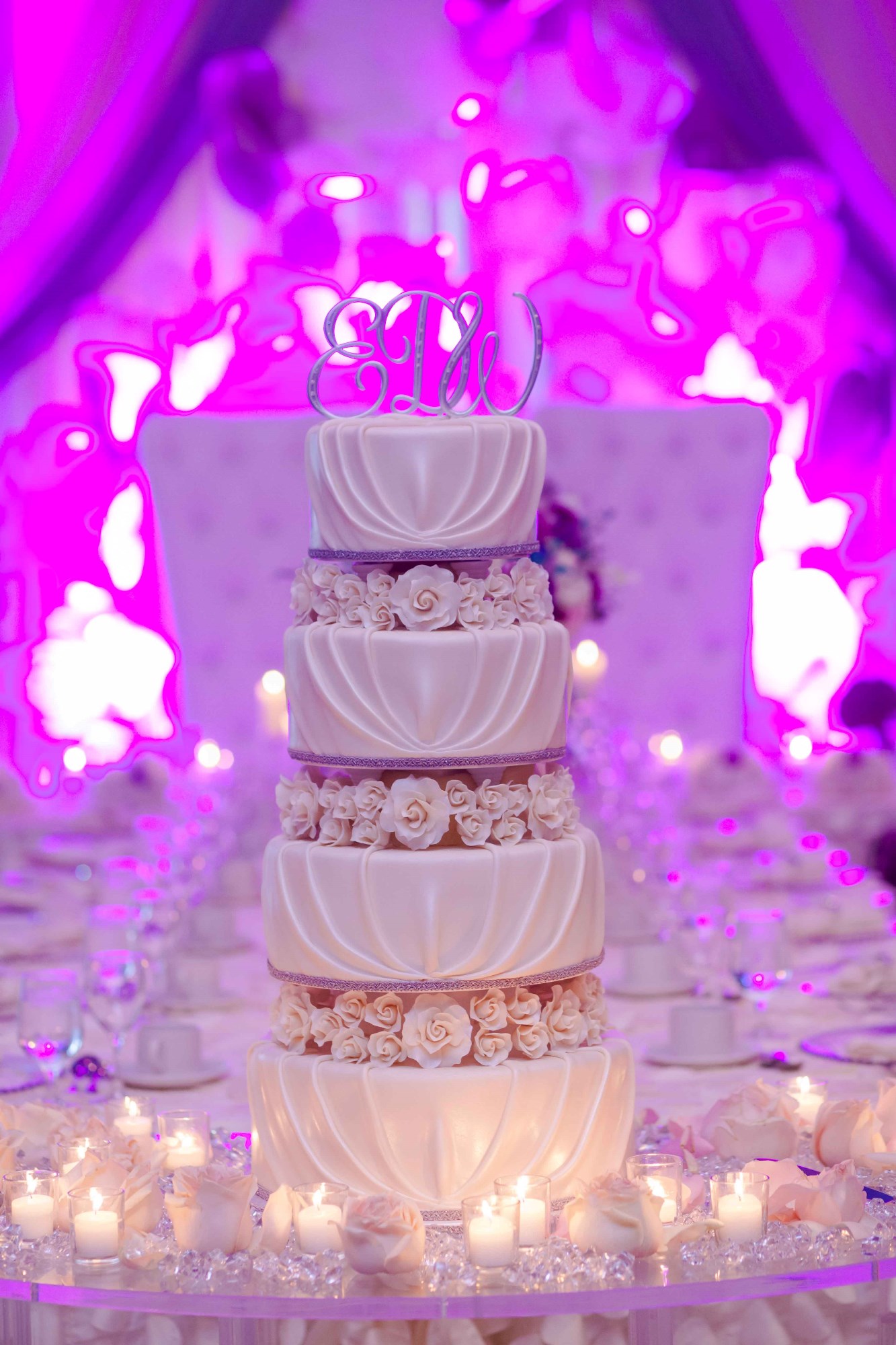 Unique pleated design which resembles a bridal gown looks amazing with sugar roses in between the tiers.