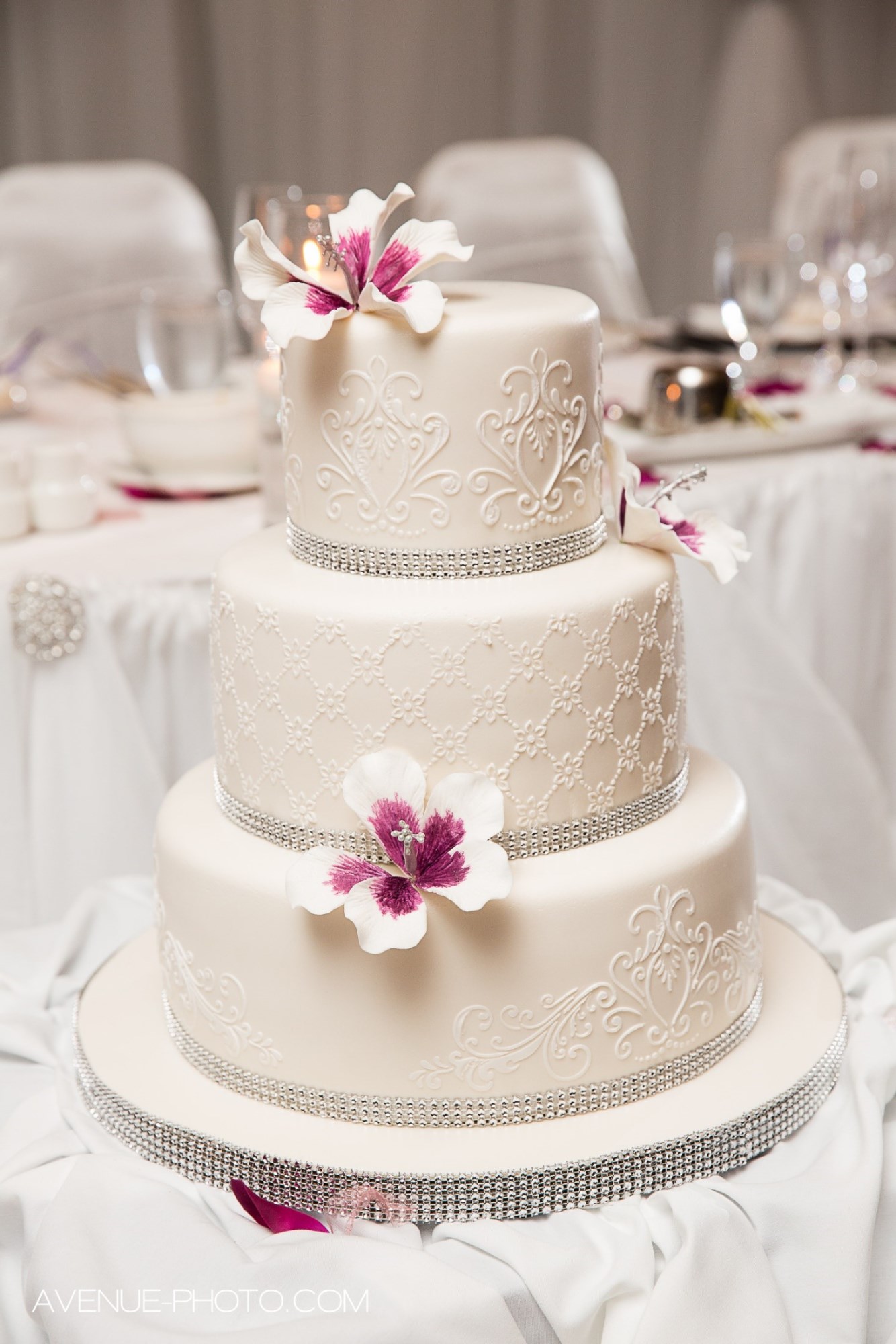 This beautiful wedding cake covered in light ivory fondant and finished with white stencil and bling ribbon; decorated with sugar hibiscuses with burgundy centres to match the wedding colour theme.