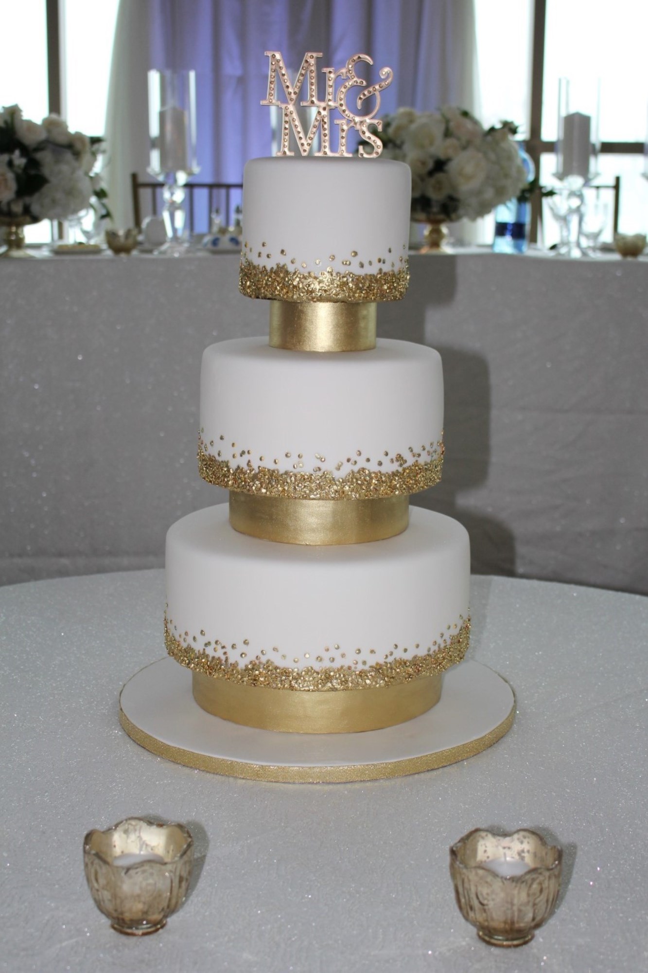 The white and golden wedding cake design was perfect for a New Year wedding; the cake topper was provided by the couple.