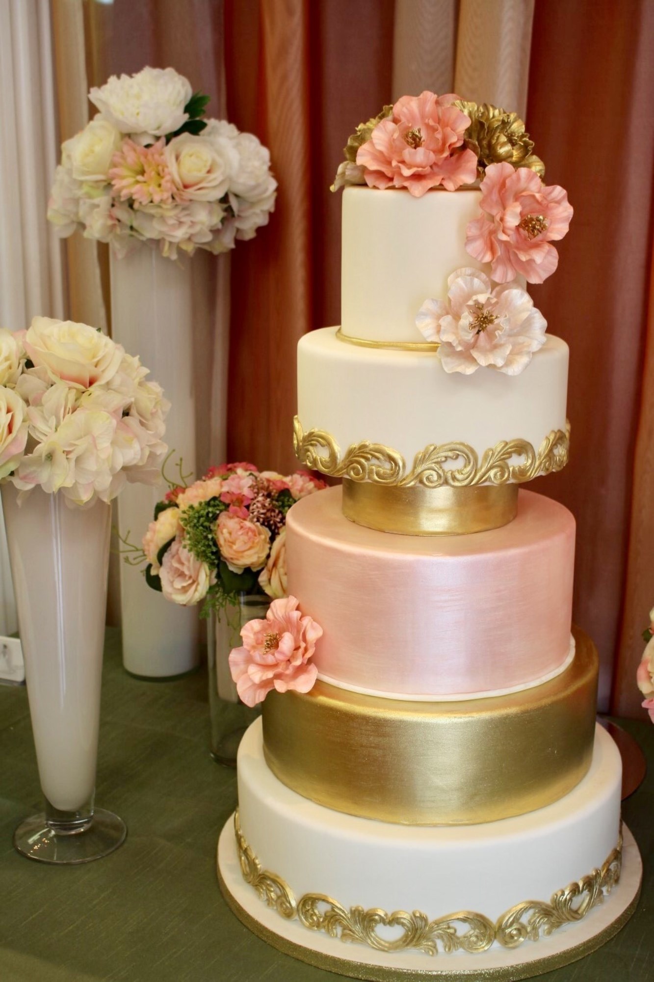This lovely white, pink and gold design will wow your guests, beautiful sugar peonies match the design and your decor.