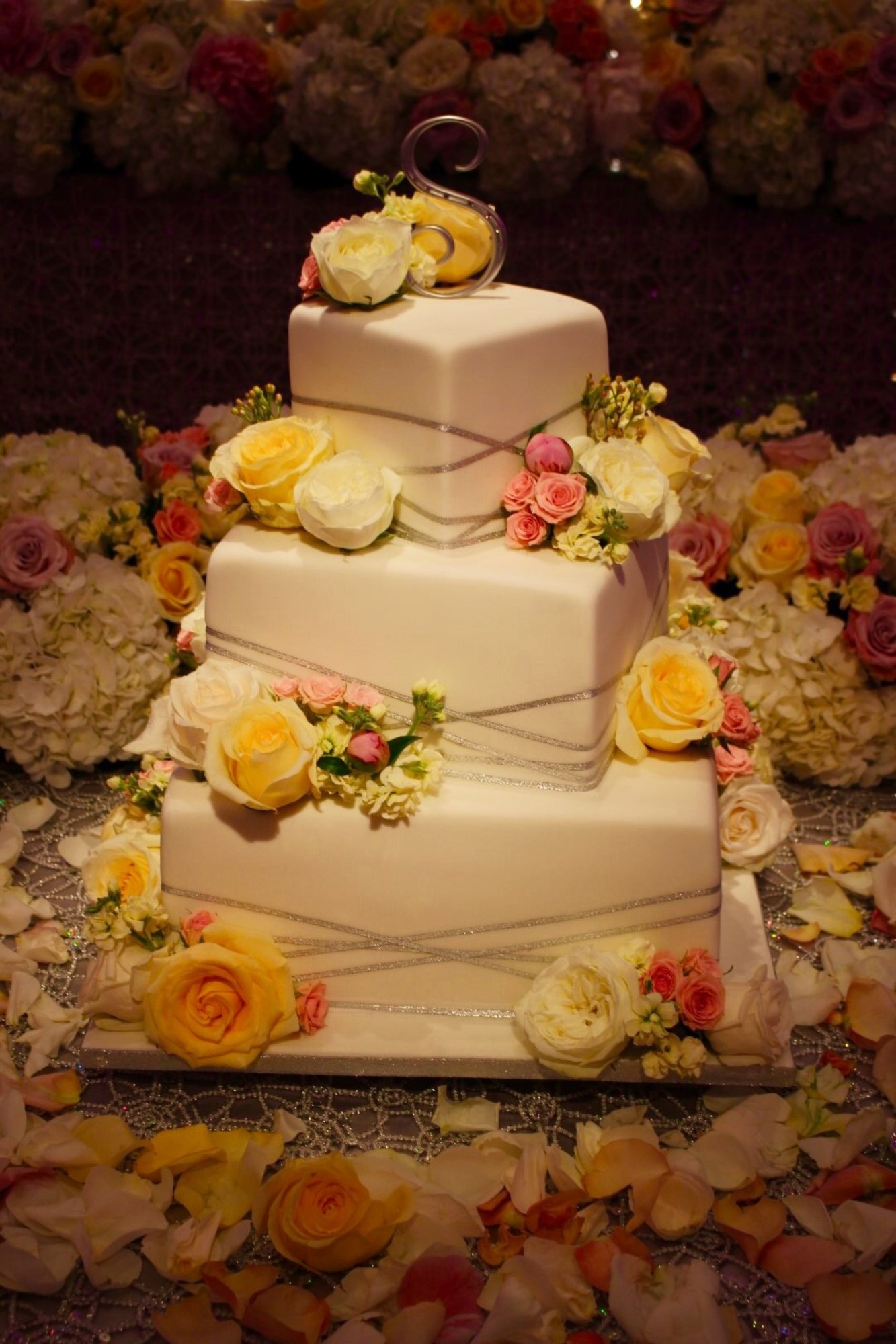 This wedding cake was a floral beauty centerpiece; the silver ribbon added some modern twist to the design and the monogram topper and the fresh flowers provided by the couple gave a finished look to this lavish design.