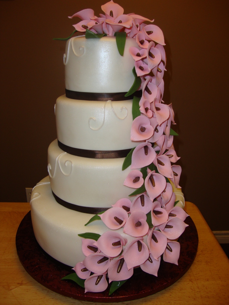 The calla lilies were made from fondant with brown stamens and pink petals to match the beautiful pink and brown wedding colour theme.