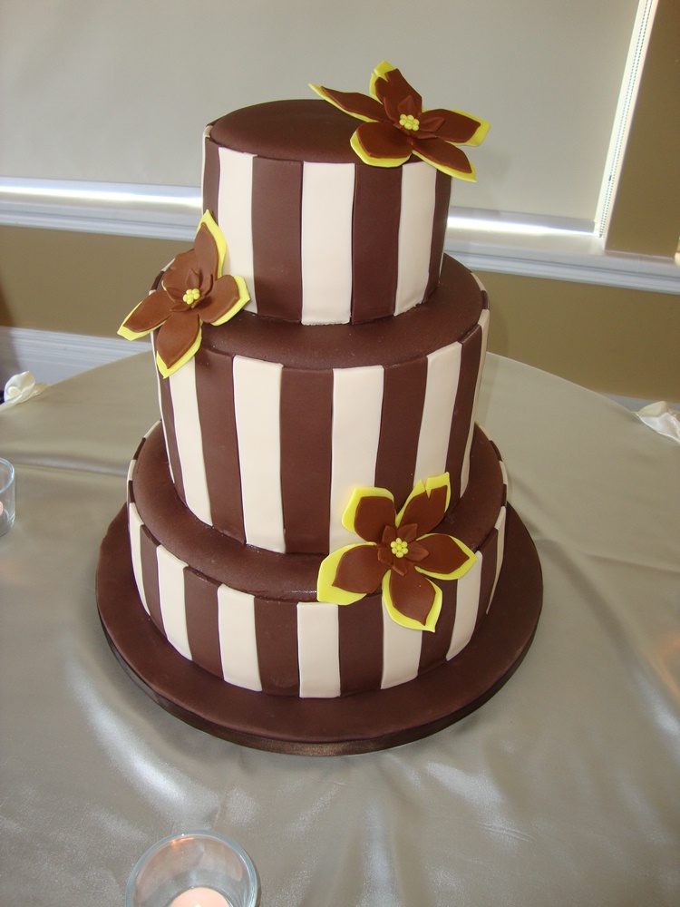"Striped Chocolate" wedding cake was done for 100 servings in chocolate and ivory fondant with fondant edible flowers.
