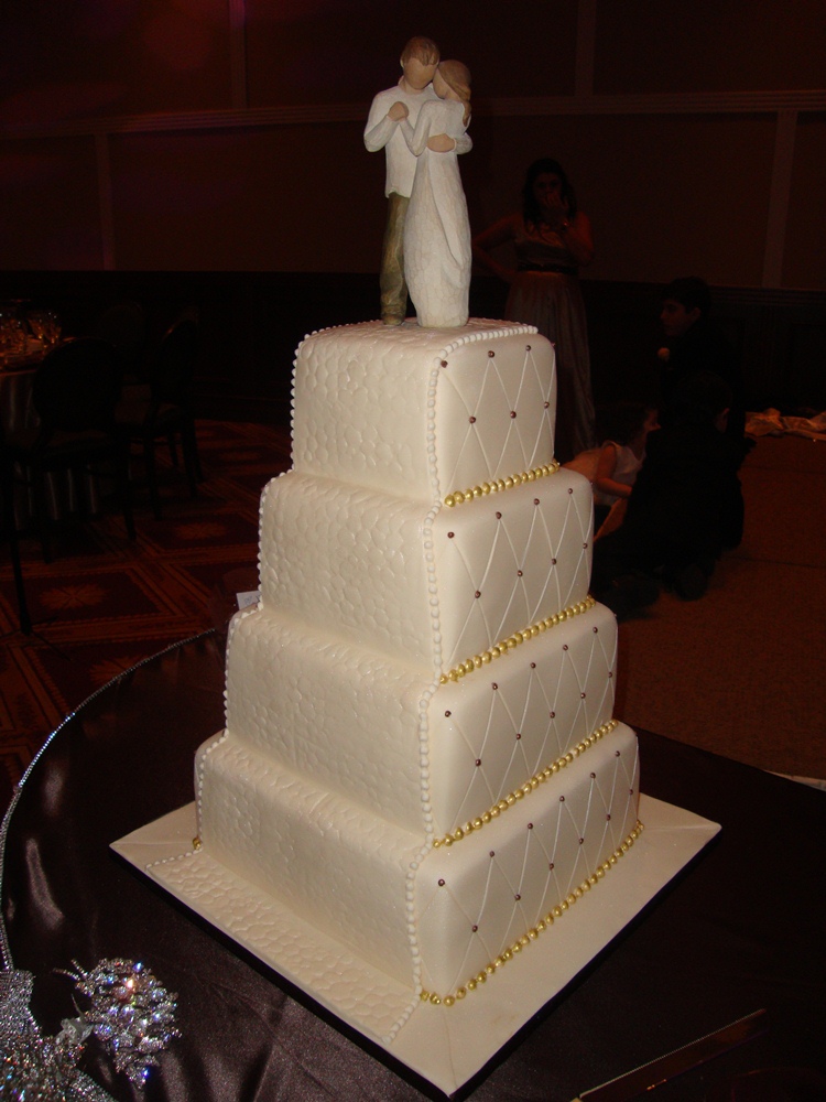 "Road to Happiness" wedding cake was created for a beautiful wedding in ivory and gold in square shaped tiers. The topper was provided by a couple. The cake served 200 guests.