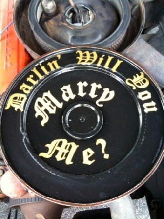 At the time, I was stationed on the Hawaiian island of Oahu, because I am in the US Coast Guard. I had flown out my girlfriend, Amy to show her the island(and propose to her). So, the next morning, December 29th, 2009, I told her to pack a swimsuit because I was going to take her out for a ride around the island to see the beautiful beaches. Now, my car is a 1964 Chevelle, and a few days prior I had wired in a secret kill switch to the car's ignition circuit. As we were cruising around the island that day, I would occasionally trip the switch to kill the engine and make her think I had engine problems(you'll see why later on...). I kept telling Amy that my carburetor had been acting finicky lately, and that I never had time to clean it before she got there. Then, after cranking the engine over a few more times without it starting, I would finally flip the switch back and breathe a sigh of relief as I "finally" got the engine to start. Then I would continue on driving and every so often I would do the whole charade all over again to make sure she bought into it completely. Amy is extremely hard to pull a practical joke on, so i had to make sure everything looked legit for the final part of my plan to work. So, finally, we made it to our destination, Kailua Beach Park, a beautiful stretch of white sandy beach with perfect turquoise water lapping at its edge and the sun shining in the middle of a clear blue sky. We laid out on the warm sand, soaking up the rays, played in the warm tropical water, and then as lunchtime approached I surprised her by pulling out the small portable grill I had stashed away in my backpack without her knowing. I barbecued lunch for us right there on the beach. We dined on fresh steak, pineapple, and veggie kabobs, potato salad, and fresh fruit, and washed it all down with some ice cold PBR's. A beach picnic fit for a Queen, to be sure! Then, after hanging out on the beach for a while, we walked back to the car, and loaded up everything. Just as we were about to start the car to leave, I once again tripped the kill switch, so the car wouldn't start. Then I acted all dramatic and upset because I "couldn't get the car to start", and asked Amy to pop open the hood while I got my tool box out of the trunk. I took my tool box, walked around to the front of the car and got down on one knee while I "looked in my toolbox for a wrench". But actually, I was looking for the engagement ring I had hidden in there the night before. Then I asked Amy to remove the air cleaner cover from the engine for me so I could "inspect the carburetor", while I continued to fish around in my tool box. I had previously painted a beautiful black and gold sign on the underside of the air cleaner cover that said, "Darlin', will you marry me?". So, when she removed the air cleaner cover, she noticed something was on the inside of it. As she did a double-take and read the sign, I pulled the ring out of my tool box, and still on one knee, I asked her to marry me. She started shaking and crying and was totally surprised and then she said yes! We embraced and kissed and enjoyed the special moment. A few minutes later, after we both calmed down, I explained to her about the kill switch and about faking all the car trouble and rubbed in the fact that I finally was able to trick her and that she never had a clue it was all staged. I then handed her my phone, with a full charge, so that she could start making all the necessary phone calls as she wanted to tell all her friends and family the good news. Next, we cruised back home in the chevelle, now "miraculously" trouble-free, taking the scenic route back, with my fiance curled up next to me on the big front bench seat. We cruised up through North Shore, enjoying the scenery and stopping for some world-famous spicy shrimp at the shrimp shack. Once we got home, we both got dressed up and I surprised her with a beautiful dinner reservation at the acclaimed restaurant Top of Wakiki, offering a gorgeous 360 degree view of downtown Waikiki from the top floor of the building. It was the best day of my life! | ||||