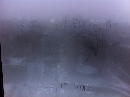 "Oh, you might know my son, Greg!" I won't say it was love at first OR second sight, because my first thought was, "Oh no! ... I hate that guy!" After a while though, I became friends with his younger sister. When Greg moved to Guelph with his dad a little while later, I didn't see him for another few years until our paths crossed once again - he moved back in with his mom, and this time we clicked and became really close friends. For five years we were just friends - until Greg asked me to be his girlfriend. At the time, I politely declined because I was afraid it might ruin our close friendship. But a few months went by and I realized what a good friend Greg had been to me, so I changed my mind, turned the tables, and asked him to be my boyfriend! Like any relationship though, we had our ups and downs. One particular fight we had made it seem like maybe we just weren't meant for each other. We parted ways and didn't speak to each other for weeks - and I can honestly say it was one of the hardest times of my life! We were no longer next door neighbours, but we shared the same workplace and having to see him every day knowing that things were over between us was agonizing. I was devastated - I knew we'd made a mistake and I think he did too, because we ended up getting together one night to talk about things. We realized how miserable we were apart and how much we missed one another. Together we decided to give our relationship another chance, hoping it might last. Well, it's been seven years now and time has FLOWN by. We grew incredibly closer over the years, bringing out the best in one another and making each other laugh. Greg always joked with me, saying he never wanted to get married, and I had basically convinced myself that marriage was just not in the cards for Greg. I was becoming pretty discouraged. Still, things were good between us - we would plan weekends in the city or up north at a cottage to get away together. Near our seven year anniversary, Greg mentioned something about booking ourselves into a hotel to celebrate, so I booked us the best of the best at the Sheridan Hotel in downtown Toronto. That night, we decided to head out on the town to find something fun to do. Of course with our luck, it was the coldest night in February - minus 28 degrees Celsius with the wind chill ... Brrr! I suggested we go to a bar for a few drinks, but Greg wasn't interested. He wanted to head down by the pier for a walk. I reminded him that it was FREEZING COLD outside, but agreed anyway. We walked hand in hand down to the pier at the end of Bay Street. I have to admit I was still feeling a little bit disappointed, thinking Greg would never propose ... But I was mostly concentrating on trying not to slip on the ice and snow! Oddly enough, despite the cold weather, there were still a few ducks swimming around by the pier. They quacked at me and I repeatedly quacked back before I stopped and realized Greg wasn't beside me anymore. I turned around to find him down on one knee, with the ring in his hand, asking, "Jaimie, will you marry me?" I was shocked! The first thing that came out of my mouth was, "Are you kidding me?!" He didn't get a chance to reply before I jumped into his arms, screaming, "Yes, yes, yes, I will marry you! I thought you'd never ask!" (See attached photos. The second picture is a little hard to make out, but it says on the Hotel window "We got engaged, in the heart - Jaimie & Greg, February 11th 2012) |