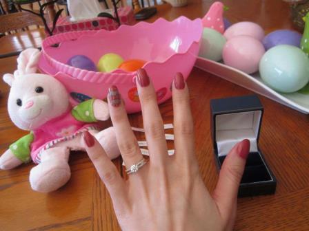 Exactly 1 year and 1 month later on Good Friday (Mar. 29, 2013), Peter organized an Easter egg hunt at his house for me. The second those pink bunny ears landed on my head and an Easter basket in the shape of an egg was around my arm I was smiling from ear to ear! I started running around the house picking up clues to the next hidden egg which contained a Cadbury egg and another clue inside telling me where to search next. I didn't realize it at the time but all the clues had to do with the family, the home and love. My hunt began in the dining room which lead me to the kitchen, then the family room, then the living room and finally to Peter's bedroom where he had a video montage set up composed of photos from our past year together including our trip to Niagara Falls, Darien Lake, and Italy and sporting events like the Jays and TFC game we attended and other memorable moments, holidays and get-togethers. He interrupted the video montage with himself on camera apologizing for the interruption which had me laughing out loud and then he asked me to grab the little bunny that was sitting in front of the TV. Peter said he never saw me move so fast before because I moved with lightning speed and grabbed hold of the bunny and the second I felt a ring box stuffed inside the bunny the waterworks started. He grabbed the ring box from my hand and got down on bended knee and asked me to marry him and I of course said yes in between the crying and shaking. I was a mess and honestly never thought I was going to be one of those girls that breaks down in tears when she got proposed to but sure enough I was and I surprised even myself with my reaction. It took me about 4 hours for my hands to stop shaking so that we could take a non-blurry photo of the ring. We celebrated with Peter's family over champagne and made all the necessary phone calls to our immediate and extended families and had our Good Friday seafood feast later on for dinner! The funny thing is, an hour before Peter picked me up to drive me to his house I had posted a photo on Facebook of my left hand to show off my Easter egg accent nail and soon after that there was a ring on it! It truly is an accent nail now!! How many soon-to-be brides can say they took a photo of their left hand an hour before they were proposed to haha. |
