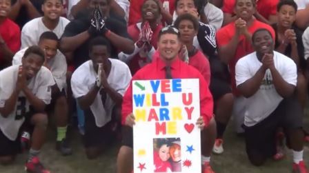 How I asked: I decided to get the football players involved with my proposal for two reasons: 1) I spend many hours with these kids in and out of the season, and they are a big part of my life 2) I wasn't too fond of the typical proposal because it just wasn't our style. So, I called a team meeting during the football period and started the meeting with "I've been here for seven years and I think its time for a change. Change is always good." The players looked at me with a saddened look, thinking that I might be leaving the program, but instead, I explained to them I wanted them to be involved with my proposal to my girlfriend. The room erupted with emotion and excitement. After I calmed them down (after 10 full minutes) I gave them the game plan. The plan was to have a fake fight, just to grab her attention, because I knew she wouldn't watch a regular practice. I would build up the fight with her throughout the week after it happened so it will keep her interest. The kids followed through with the plan perfectly and didn't a great job of acting as you can see on the video. The video continues with me calling up the group and having them take a knee all at the same time. I took my jacket off to reveal a shirt and tie (with my coaching shorts on) and held up a sign I made a day prior that said, "Vee, will you marry me?" The video was then revealed to her on a Saturday (2 days after we recorded it). I set up my Ipad to record her reaction. Once the sign was shown on the video, I got down on a knee next to her in the kitchen and proposed. Her reaction was priceless, but yet nerve racking because I was waiting for what seemed like an eternity. She finally said yes and the game plan was labeled a SUCCESS! |