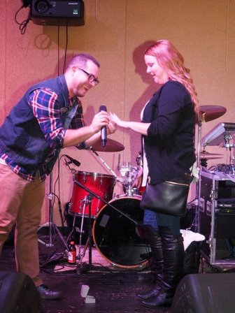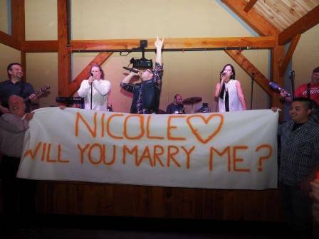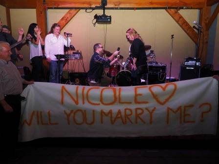 Dan and I planned to go see a local 80s Rock cover band and meet my parents. My sister came to visit and we were going to surprise my parents. During the second set of music, the band asked for someone to come up to sing the next song which was "Shut Up and Dance". Knowing that Dan used to be the lead singer of a band and that the song was one of our favorite songs, I started pointing to him and saying his name to go up. The band choose him and he went up to perform. I grabbed my phone and started recording his performance. During the song, my father and Dan's best friend pulled out a banner that said "Nicole Will You Marry Me?" After the song was over, they pulled me up on stage and he got down on one knee and asked me to marry him. Of course I said, "YES!"