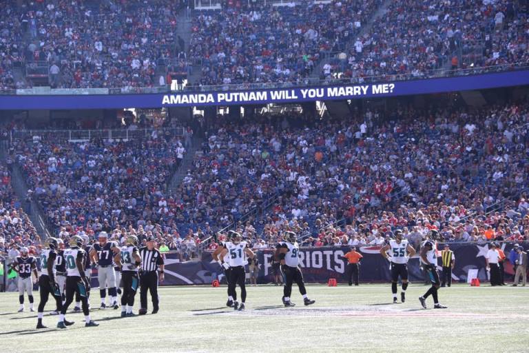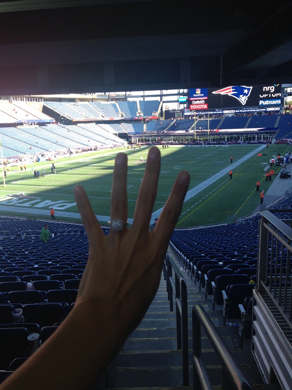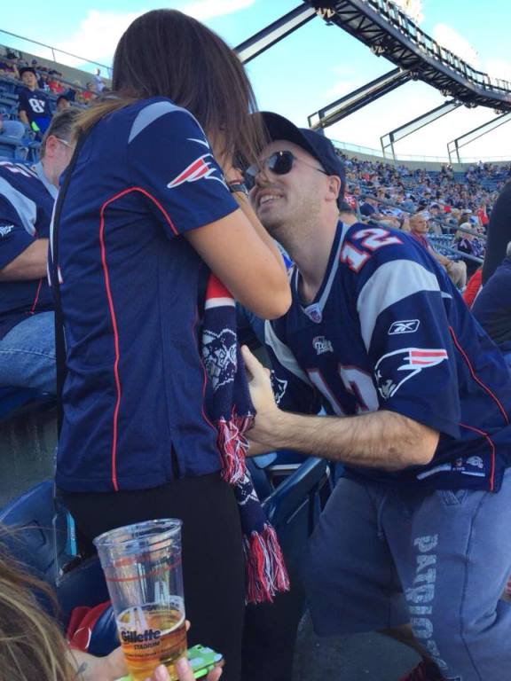 Our first date was wings and beer at Buffalo Wild Wing to watch the Boston Red Sox World Series game. Tim in a Boston native and I just love sports. I asked Tim to be my 'boyfriend' by making a hide in seek game in his desk at work, the end prize was two tickets to a very cold December 28th game in Foxobrough, Mass to watch our Patriots take on the Buffalo Bills in week 17. So it would only make sense to have our story continue in that stadium, there the next story begins. Every fall for the last three we make two trips; the first to Buffalo to watch the Pats take on their division rivals, the second to Boston to watch the Pats at home. In 2014 it was a special trip; we were at the week 5 comeback against the Bengals that took the Patriots to the Superbowl where they would become world champions. That night as he swung me around and cheered in the living room, I said 'since you got another ring (that was the Patriots 4th Superbowl in 14 years) I should get a ring'. We laughed it off and agreed that we needed to start saving to purchase a house. When we got the house we could talk engagements and babies. But little did I know my not so romantic boyfriend was about to surprise the bejesus out of me. September 26th 2015 we left for Boston at 5am, Tim made me go through security first at the airport and seemed a little more tense then normal. I chalked it up to extreme exhaustion and carried on. We landed in Boston and took the subway to our hotel in the downtown core. That night we had tickets to see the Red Sox play at Fenway so we had a quick lunch, got geared up and met up with some of his family at a bar nearby for a few beers before the game. While we were at the game a couple got engaged right in front of us, I got all mushy and he said how cool of a story that would be but again I knew our plan so I continued to just enjoy our weekend away. Then Sunday rolled around, in Boston they have a train that leaves from the main terminal and drops you off in a forest right outside Gillette stadium, respectively named the Pats train. Tim does not travel well; he gets really sweaty and instantly nauseous in planes, cars and trains. But normally some conversation and funny selfies can get him over the two hour train ride from Boston to Foxobrough. This time, we seemed distracted and off. Again I chalked it up to an early morning since this year our game was at 1pm and normally we saw games in the late evening. We got off the train bolted to the stadium and joined the line to go through security, again he made me go first and let a few other people in between us which I found strange but the excitement made me gap and go right back to grabbing his hand and running to our seats. The game was great, a blowout against Jacksonville. The one thing that sucked was the family playing musical chair next to me. Every quarter I had two new people to my right. I guess the family couldn't get tickets together so they all took turns sitting as a group of 4 in another section and then sitting as a pair next to me. As the fourth quarter rolled around the win was locked, I got friendly with the drunken girl and her boyfriend next to me taking pictures and trying to explain where Barrie, ON was to them. Tim at this point wouldn't sit, he just kept standing leaning against the bar in front of me. He looked so serious and had a model like face on so I kept talking pictures. I went back talking to my new friend when she gasped, I looked back and there was my phenomenal boyfriend point at the tracker around the stadium, in huge cap letters it said 'AMANDA PUTNAM WILL YOU MARRY ME?'. Then I looked down at this gorgeous double halo basket ring and started balling. I said yes and our whole section cheered. Shaking and smiling we got hugs from everyone and marriage advice from Boston natives. Walking out of the stadium I took pictures with my hand against the field and texted all our friends and family on the way back to the hotel on the train. On the train ride he told me how much work he put into this. He researched what to do if airport security asked to search his bag. He hid the ring inside a sweater folded in his bag. He knew how strict the NFL was so he didn't bring the box just the ring wrapped up in silk in his sock. He contacted the statdium and made a donation to the Children's hospital in order to have my name around the statdium and then made reservations to 'The Hub', a restaurant at the top of the tallest tower in Boston that overlooks the city at night. He also did the one thing a single mom could ever want; he bought my daughter Haylen a ring of her own that he would give her upon our return. I never expected to find a man, especially when I was 23, that would take Haylen and I on without a single compliant. He treats her as if he was her own, he is there for me whenever I need him for whatever; whether it's driving her to school, taking me to the doctors or just coming because we need him. I'm the luckiest girl to be marrying my Boston boy <3 |