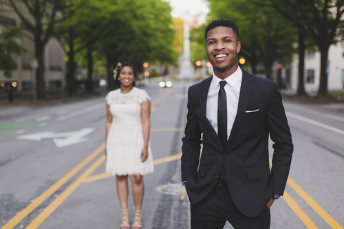Jarami cleverly conspired with my friend and fellow style blogger, Tiffany, to invite me to a 'blogger event' as her +1, so of course I dressed up and got cute without hesitation! She picked me up and we headed to the Georgian Terrace hotel, which was super nice. We walked into the lobby and all of a sudden she received a call from her 'mom'. She told me she had to take it, and walked away. I turned around and she had completely left my sight! As I sat down on a couch beginning to think something was up, out comes Jarami in a full suit with a single rose! Clearly nervous, he walked me to the elevator. When we got off on the top floor, he showed me to a double spiral staircase covered in rose petals and lined with candles. Our friend, Josh, was there playing his guitar and serenading us during our special moment. He walked me up the stairs, led me to a circle of candles and poured out his heart to me. Crying and overwhelmed with joy, I said yes after he got down on one knee and popped the question. I couldn't have imagined a more romantic proposal!