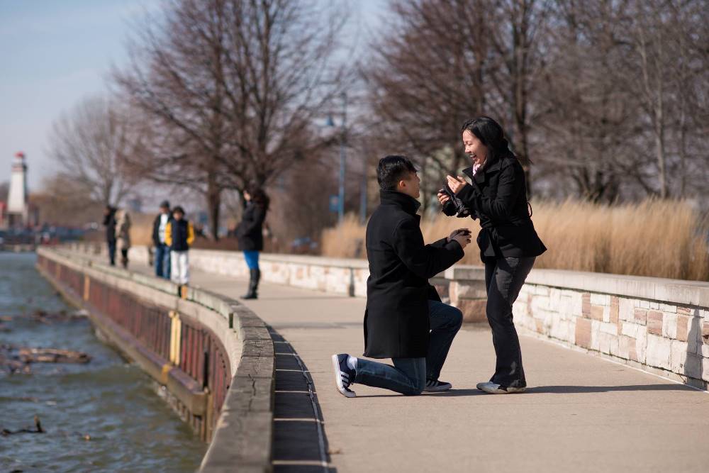 Coincidentally my friend "recommended" the same Italian place a couple weeks prior because she had a "coupon that was soon to expire". My response "oh my gosh - what are the chances - my bf's co-worker recommended it, and you recommended it and during the same weekend - It is fate". Little did I know, he was working with my co-worker to get me to the Port Credit area (where we had our first kiss) but had to do so without looking suspicious, and he knew my frugal Asian ways would jump at the opportunity of a "coupon deal". During lunch, he went to the restroom quite a few times, and kept checking his phone. He wore his contacts that Sunday morning, and looked more polished than usual. I asked him about it, and he said he just went to the gym. In hind-sight, I should have thought things were different that day, but hindsight bias is always 20/20. After lunch, it was a beautiful day and he suggested we walk along the boardwalk. At the end of the boardwalk he takes my hand, and on bended knee says "I want to make sure I do this right and I should have done this long time ago" - and promises that he would spend the rest of his life making me happy, if I would like to spend it with him. I think my reaction says it all in the mini video. Turns out that my fiancé had been planning this for weeks, and was constantly going to the restroom to text his friend, who he had staked out with a camera to capture our romantic proposal. We then did a mini photo shoot on the spot to celebrate. Of course I couldn't wait to share the news with my friends and family (who gave their blessing to him months ago). It was a wonderful surprise - and the wedding planning has been a wonderful experience that has brought us even closer together. |