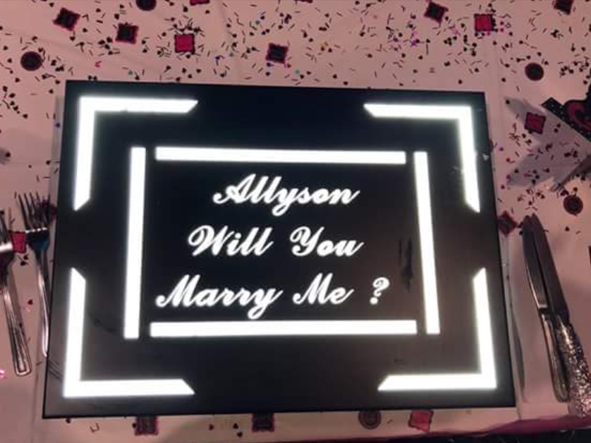 The proposal was months in the making and a very well-kept secret from Allyson. It was Allyson's birthday and she had no idea how eventful the night was going to be. She knew we were going out to dinner but after seeing the weather she wanted to order in and stay home. It was cold, and had started snowing heavily earlier in the day. She was also a bit upset that no one had spent time with her earlier in the day. Eion claimed he had laundry to do, among other chores. Allyson never liked to make a fuss over her birthday but she had a higher expectation that having to spend it alone watching Netflix. What she didn't know was that Eion had planned a surprise birthday party at one of their favourite restaurants and had actually spent the day running last-minute errands and decorating the place (and yes actually doing a load of laundry also). The most difficult task of the day wasn't hiding everything, but it was convincing Allyson to leave the house and get to the restaurant for the big surprise. Very reluctantly Allyson went along to the restaurant and was shocked when she walked through the doors and saw all her family, friends and all the decorations. The night progressed, everyone enjoyed dinner, and mingled. Eion had it all planned and had a calm demeanor even though he was a little nervous. After the birthday cake was cut, Allyson learned that the cake stand could light up. She was then instructed to crouch down to plug the cord into the electrical outlet. When she stood up, the cake had been moved and she was completely shocked to read "Allyson will you marry me?" in bright lights from the cake stand. There Eion was, down on one knee with the most beautiful ring. After complete disbelief and a bit of freaking out, Allyson realized Eion was still on his knee waiting patiently for an answer. Allyson said yes! The room was then filled with many cheers and happy tears. |