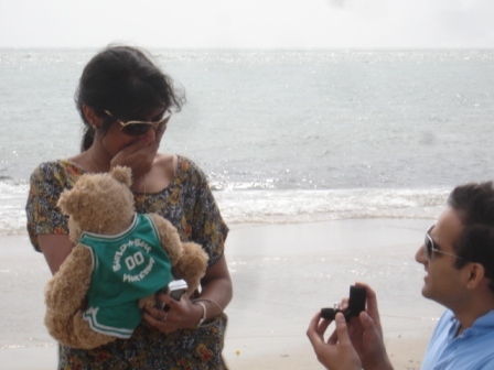 Seeing how sad her dad is, Amelie steals the garden gnome one day. She photoshops the garden gnome into pictures of famous world attractions to make it seem as though the gnome has visited each of those places. She then sends these photoshopped pictures to her father, who is totally confused and starts to think that the inanimate garden gnome is somehow traveling all over the world. This confusion eventually inspires the father to get out of his funk and travel himself. Anyway, I borrowed the garden gnome concept for the proposal. A few weeks before we left for India, I rewatched Amelie with Gaya to make sure the movie was fresh in her mind. Then I stole a stuffed toy that she owns (a bear called Mr. Clutch, the first gift I gave her) and had him photoshopped into pictures of various places we were going to visit on our trip (my friend Ajaya helped with this part). I used these pictures to make postcards addressed from Mr. Clutch and slipped them to Gaya one by one over the course of the trip. I timed the postcard deliveries to make it seem as though the bear was always one step ahead of us. The list of postcards (major places we visited) in chronological order is as follows: Gateway of India (Mumbai), Pune (city where I was born), Allepey Backwaters (Kerala), Kanyakumari (Southernmost tip of India in Tamil Nadu), Meenakshi Temple (Tamil Nadu), Rameshwaram (Pamban Island, Tamil Nadu), and Dhanushkodi (tip of Pamban Island, Tamil Nadu). Dhanushkodi is of special importance to us because it is the closest point in India to Sri Lanka, which is where Gaya is from. It also holds important Hindu mythological significance as it is the location where King Rama (avatar of Vishnu) built a bridge to Sri Lanka to rescue his wife Sita from the clutches of Ravana. Here's some more detail: http://en.wikipedia.org/wiki/Dhanushkodi Dhanushkodi is one of the craziest and most remote places I've ever visited. It is a narrow strip of sand surrounded by the Bay of Bengal on one side and the Indian Ocean on the other. We rented a jeep that took us to the very tip of the peninsula, which was no more than a few feet wide. Other than the jeep driver and a group of 5 people a few hundred feet away, we were the only people there. It literally felt as though we were standing on the ocean. Once we got there, we found pawprints leading to Mr. Clutch (my parents helped with this part). Gaya picked up the bear in surprise and I asked her to check if he was ok. When I first gave her the bear over three years ago, I had added a recorded sound in its paw that went off when you pressed it. After I stole the bear from her, I switched this sound to the other paw and put a second recorded sound with the proposal into the original paw. When Gaya picked up the bear at Dhanushkodi and pressed its hand to see if the sound still worked properly, she was surprised to hear me proposing to her instead. At that point I dropped to one knee and opened the box containing the ring. All in all, everything worked out perfectly. Some random/funny notes: 1) Gaya was so surprised when I got down on my knee that instead of saying "yes", she said "I do". From that point on, "I do" became an inside joke for the rest of the vacation. 2) Allegedly, one of the same rocks that was used to build Rama's bridge is preserved in a small hut-like temple on Pamban Island. It's a big porous rock that floats in water that we had the chance to touch and take pictures of. 3) My friend Tsung-Han had given me a cuban cigar a while back. To celebrate the success of my proposal, I lit it up Red Auerbach style. |