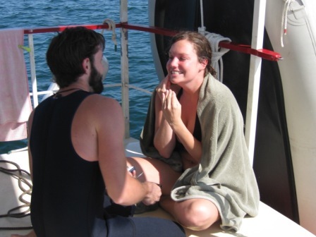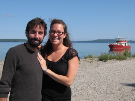 Our trip in 2008 was equally beautiful, and even more fun with the company of Opa and Derek's cousins Nick and Alex DeDeckere! For some reason, I thought in the back of mind, that Derek had remembered our last adventure with that valve ring, and that this year I would get a real ring. So I packed accordingly, and wore my pretty sundresses and skirts the entire trip - waiting for that picture perfect moment when he would get down on one knee and ask me to be his wife. I was sure to look beautiful the entire trip, dressed to the nines, makeup on and hair done - every day. Not exactly the most practical of things to be doing on a boat in the middle of nowhere! But to my great surprise, on the last day we set sail for home, there was still no ring on my finger. I was so devastated, and remember very clearly crying below deck with Derek's mom, thinking he was never going to propose and that I was sure he didn't want to marry me. Another year went by, and we left for our 2009 adventure in Georgian Bay on August 29th. This year, I had already prepared myself for no proposal. I thought for sure, this was just not the right place for Derek to ask me, and that maybe he was just not comfortable asking in front of his entire family. At least I was at peace with this, and didn't dress up like a retard anticipating something that would never come. We traveled around to a few shipwrecks for the first 3 days, and anchored in our favorite bay on September 1st, just off of Beckwith Island where the horizon goes on forever, and you can see the most beautiful sunsets you could ever possibly imagine. The sand is soft and squishes between your toes, and there are two beautiful bays optimal for anchoring the boat in sheltered place, regardless of which direction the wind may be blowing in that evening. As we finished dinner and the night wore on, a couple arrived in a small dingy dragging something very heavy on the bottom of the bay. The entire family became very curious as to what it was that they had towing behind their small vessel, as they would not pull it up on shore, nor would they leave the bay during light. John and I peered through the binoculars below deck hoping for a glance at their coveted treasure, but the couple had carefully placed their boat between us and whatever it was that was in the water. It looked terribly important and heavy whatever is was, as the man was in the cold water trying to rig up a better way to drag it out of the bay, and at one point, even the woman entered the water to help him. Our imaginations were running wild with the anticipation of figuring out what they could possibly have, and why it was so valuable. All we could dream was that they had taken something off of a nearby shipwreck, and were taking proper precautions to not be caught in this very illegal act. Or maybe it wasn't treasure at all, maybe it was drugs that were dropped, or who knows what! At any rate, we all went to bed not knowing how that story really ends and the next morning John set out on the open water bright and early. When I woke up we were above the Thomas Cranage, one of our favorite shipwrecks to dive on. I was surprised that Derek was ready and eager to snorkel right away, and John too was suited up in his scuba gear getting ready to jump in early around 9:30am. I however, was not so eager to enter the freezing cold water so early in the morning and so I doddled about the boat very slowly still in my pajamas, enjoying coffee on the top deck with Sandra, contemplating if I'm even going to go in the water. It was a little windy out that morning, and the water was only 65 degrees Celsius and sometimes a wet suit just isn't going to cut it. But as I meandered about, Derek still in the water, and John scuba diving, Teresa announces she will be going in the water too. At that point, there was really no getting out of it - if Teresa was going in, so was I. So I went below deck to get ready, put my bathing suit on, and then my contacts so I could see with my goggles on (this all probably took me maximum 5 minutes). I finally get into the freezing water, and swim around for 10 minutes or so checking stuff out and go back to the boat to sit on the swim platform for a second while I adjust my mask. But Derek swam over asking if I'd like to go take a look at the ship's boilers with him. So back in the water I went, exploring the wreck some more, when all of a sudden I spotted something that didn't look like it belonged. There, sitting on top of the Thomas Cranage decking, was an old box tied with some rope! A million things raced through my mind at once as I popped my head out of the water with excitement announcing to everyone to hurry over, I had found a real treasure! I tried to swim down to get it but it was in 20 feet of water and was unable to make it. So I sent Derek down to retrieve it, and together we pulled the rope with the heavy box back to the boat. I couldn't wait to get it open. All I could imagine was the secretive couple from the previous night, and that perhaps they had dropped something along their way. As we managed to get the box onto the swim platform, what looked like blood began to poor out of its sides, and Sandra commented that maybe there was a hand or foot locked inside! I struggled with the box, completely oblivious as to the fact that Derek was now on one knee across from me. When I finally got it open, I knew exactly what was happening. He had filled the box with beautiful stones from the shore, that original valve ring he recovered in 2007 and in the middle was a small box. In my shock, I shut the box, gasping for air and crying for joy. Derek took my left hand, and opened the treasure box, removing that tiny box inside of it. He told me that I was the love of his life, that he couldn't imagine spending it without me by his side. And then, over the Thomas Cranage, he slid that beautiful diamond ring onto my finger, and asked me to marry him. I was so overjoyed, overwhelme