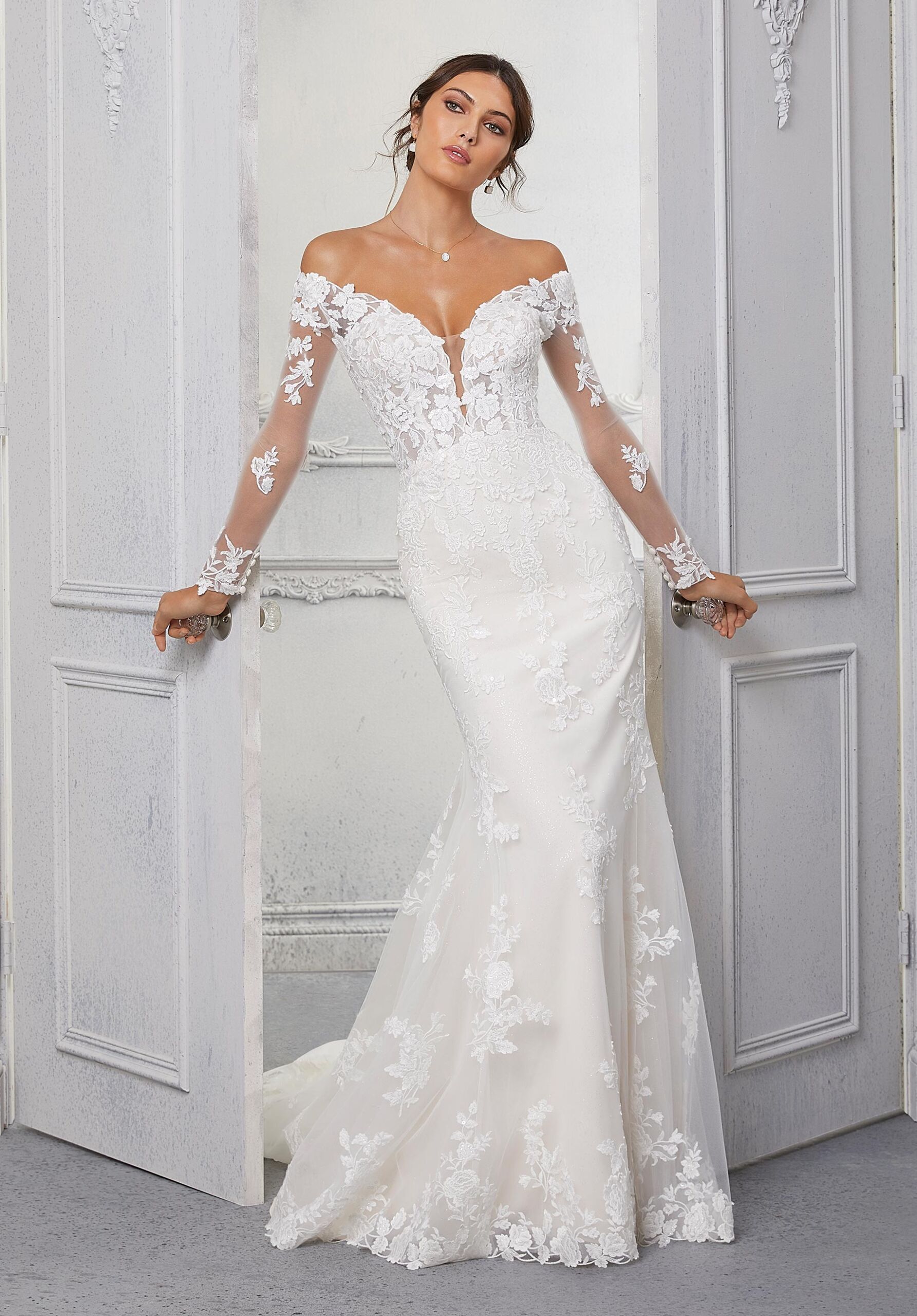 About Cindy: This glitter tulle A-line wedding dress features an off-the-shoulder neckline with sheer long sleeves and an illusion back.