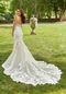This chantilly lace and tulle mermaid has a subtle scoop neckline, spaghetti straps, and a sheer back detail.