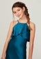 Silky satin junior bridesmaid dress with flounced bodice and spaghetti straps.