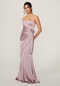 Silky satin bridesmaid dress with strapless bustier bodice and wrap skirt.
