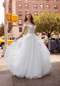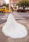 Frosted, Embroidered Lace Appliqués on a Tulle Ball Gown with Lace Trimmed Train.