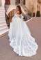 Frosted Embroidered Lace Appliqués on a Tulle Over Glitter Tulle A-Line Ball Gown with Wide Hemline Border and Sheer, Scalloped Train with Detachable Draped Off-the-Shoulder and Bishop Sleeves.
