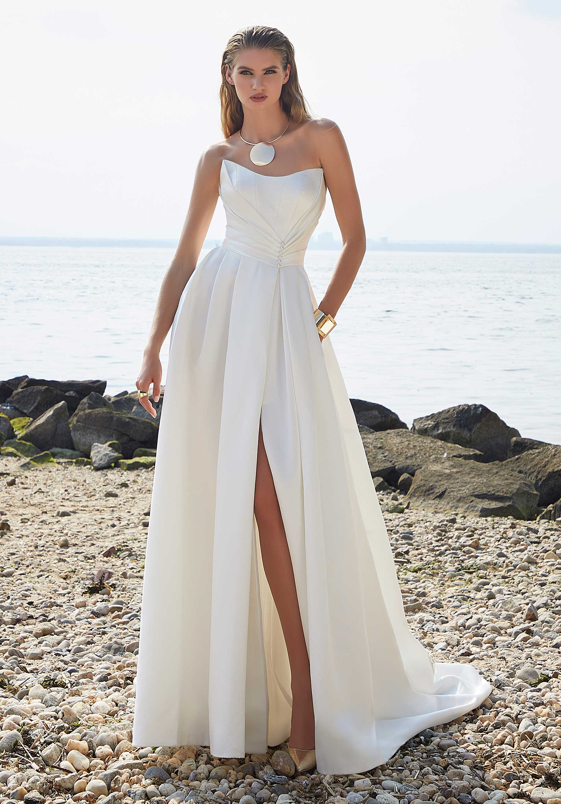 Our Palmer designer wedding dress serves high fashion bridal featuring a unique bodice with an asymmetric strapless neckline, contoured seaming, and precise draping defined by crystal button details at the waist. The box-pleated satin skirt has a sleek and structured look with a front slit for added movement and pockets for both fun and function. Shown in Ivory.
