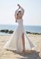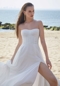 Our Pania designer wedding dress is a billowing boho A-line perfect for our more casual brides. The simple style features a sheer boned bodice with delicate draping for added texture. The flowing skirt has a front slit for more movement, while detachable bishop sleeves add to the free-spirited feel. Shown in Ivory.