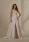 Timeless A-line has a wrap-style bodice with a modern v-notch neckline and classic box-pleated satin skirt.