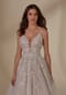 Boho ball gown has a plunging neckline on a draped tulle ball gown with pearl and crystal beading, floral embroidery, and a double waistband bow detail.