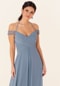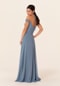 Beautiful bridesmaid dress has a warped-style bodice with tied halter straps and off-the-shoulder sleeves with leafy appliqués.