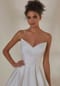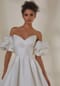 Classic Larissa satin ball gown with a wrapped-style, strapless bodice, and pleated A-line skirt. Detachable pouf sleeves add drama.
