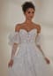 Romantic A-line has a sheer boned bodice with luxe crystal beaded, embroidered appliqués, lace-up corset back, and fairytale long pouf sleeves.