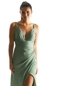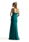 Stunning bridesmaid dress in luminous luxe satin has a pleated bust and draped waist creating an empire bodice with a sultry open neckline. The skirt has a faux-wrap effect creating a flattering drape and a front skirt slit for a pop of leg. Shown in Teal.