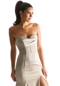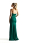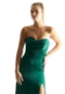 Stylish bridesmaid dress in luxe satin has a boned bodice with a strapless sweetheart neckline features a soft drape detail for added texture. The fit and flare silhouette has a sultry shape with a front skirt slit for a pop of leg. Shown in Emerald.