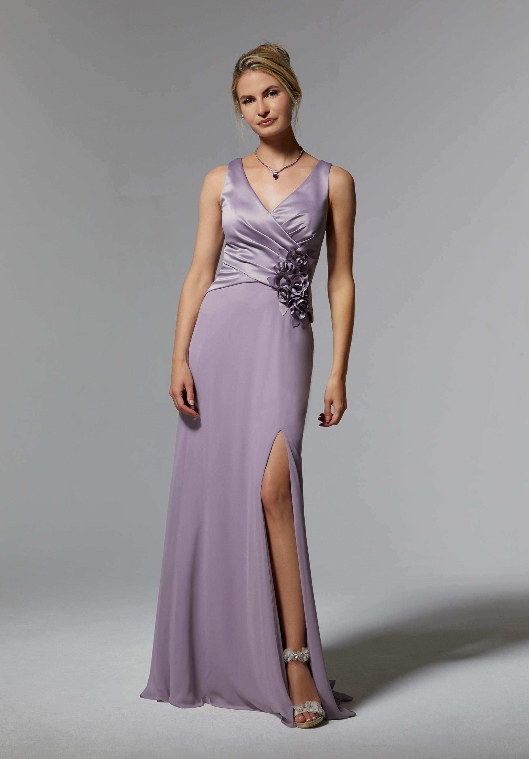 Mori Lee Collection: 72903 - Satin and Chiffon Evening Gown with Three-Dimensional Flowers Gown