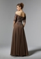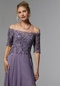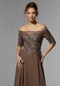 Effortless evening gown features a lovely off-the-shoulder bodice with elbow-length sleeves designed with intricate botanical beaded embroidery. The chiffon skirt floats around you in a flattering A-line silhouette with a front slit for added movement.