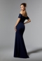 Sultry fit and flare evening gown contours the body in scuba crepe featuring an off-the-shoulder neckline with chic short sleeves. The delicate fold in the neckline creates beautiful textures enhanced by breathtaking crystal beaded floral lace appliqués that have a subtle sparkle.