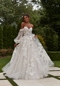 Bold frosted floral embroidered appliqués cascade down our Primrose designer wedding dress. The sheer corset bodice creates a striking contrast against the embroidery while the full ball gown skirt sparkles with every move in sequined tulle. Detachable sheer bishop sleeves add to the fairytale feel of the dress. Shown in Ivory/Champagne/Honey.