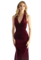 Sultry stretch velvet bridesmaid dress hugs the body in a fitted sheath silhouette. The v-neckline elongates the body on the halter-style bodice leading to the gorgeous open back. Shown in Bordeaux.