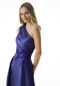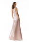 Breathtaking evening gown has a luminous glow from the Larissa satin fabric. The one-shoulder bodice features perfectly placed darts for a tailored look and elegant beaded lace detailing. A-line skirt has unique pleats to give the gown a full silhouette.