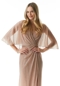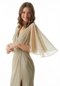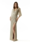 Boho-inspired evening gown has a relaxed sheath silhouette that shimmers in metallic knit fabric. Delicate draping gives the dress an effortless look creating a gathered detail at the waist and cape-style sleeves with a front skirt slit for added movement.