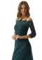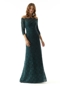 Classic evening gown has an intricate design in crystal beaded Venice lace. The off-the-shoulder neckline has a scalloped edge from the textured lace and sheer three-quarter length sleeves for a modest look.