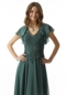 Effortless evening gown floats off the body in lightweight chiffon. The stunning v-neck bodice features elegant beaded embroidery with the feminine touch of flutter sleeves and sheer back detail.