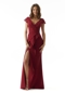 Beautiful evening gown has a structured look in stretch crepe with intricate pleating details on the v-neck bodice and fit and flare skirt. Delicate beaded Venice lace accents the waist and creates cap sleeves that are detachable for two looks in one.