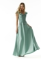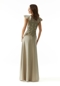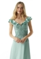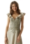 Feminine evening gown has an intricately embroidered bodice accented by delicate beading with a wide v-neckline featuring a ruffled detail. The soft A-line silhouette floats off the body in comfortable stretch crepe.