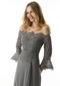 Lovely evening gown features an off-the-shoulder bodice designed with botanical beaded Venice lace and fun, fluted sleeves. The A-line skirt floats off the body in comfortable jersey with a chic draped detail and skirt slit for added movement.
