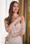 Our Rochelle designer wedding dress is a glamorous fit and flare full of intricate details. The sheer bodice has couture boning that's guides your eye down to the basque waist, creating a narrow and elongated look. Swirling frosted, medallion embroidered lace decorates the dress, enhancing the sweetheart neckline and leading all the way down to the stunning sheer train with a scalloped hemline. For a more classic look, style the dress with the matching detachable long sleeves. Shown in Ivory/Sand/Honey.