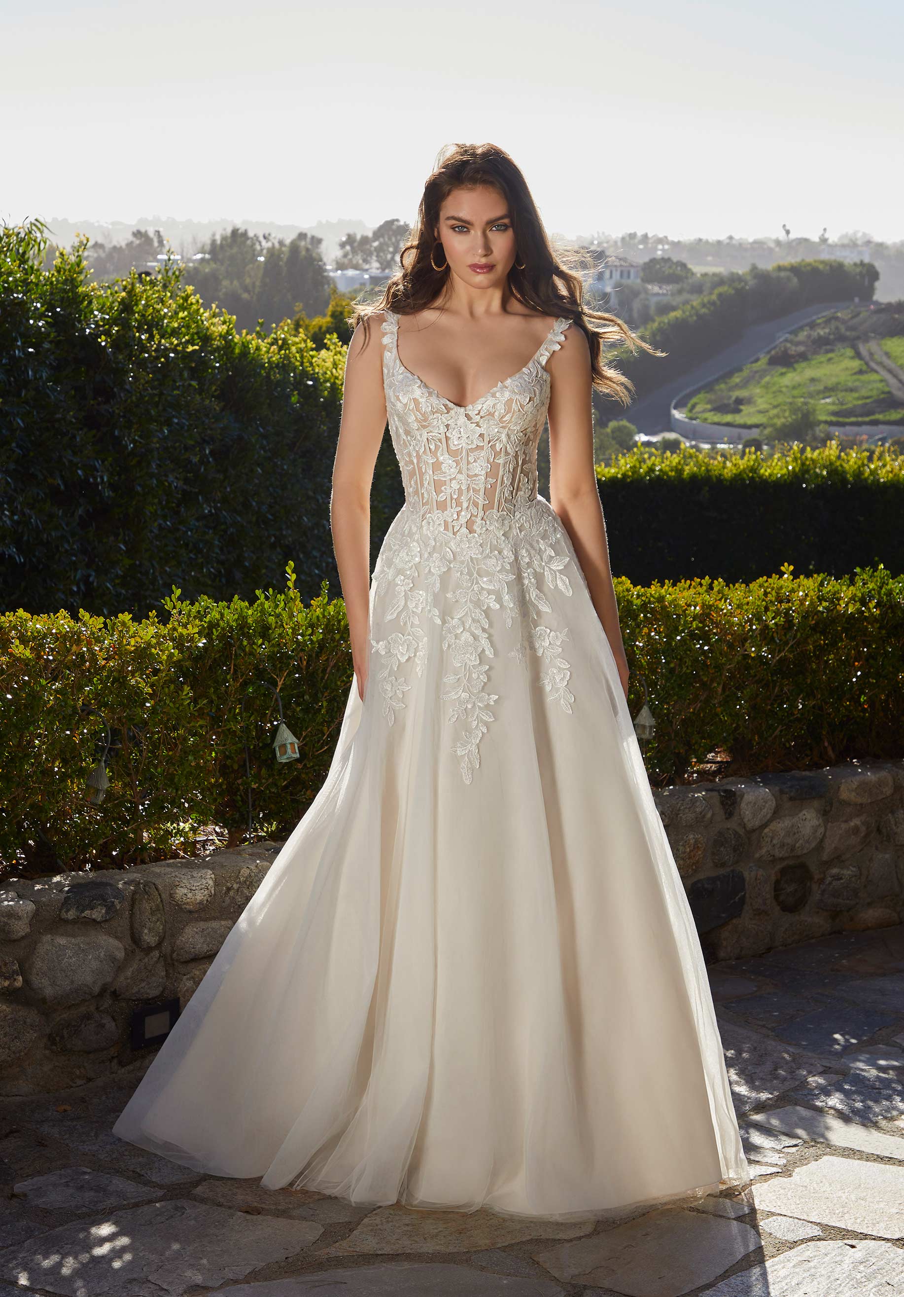 Our Romana designer wedding dress has a whimsical look with couture detailing. The stunning A-line has a sheer corset bodice designed with lovely frosted, floral embroidered lace appliqués accenting the wide v-neckline and illusion back that highlights the boning. The tulle skirt effortlessly floats around you with a lace trimmed train for a touch of romance. Shown in Ivory/Champagne/Honey.